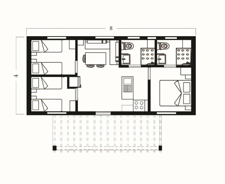 Virtual tour GrundrissAlle Mobilheime sind ausgestattet mit: Küchenutensilien, Kissen, Decken, Tisch mit Stühlen auf der Veranda. Das Auto wird in der Nähe jedes Mobilheims geparkt. Mitzunehmen: Handtücher und Kuechenwaesche.